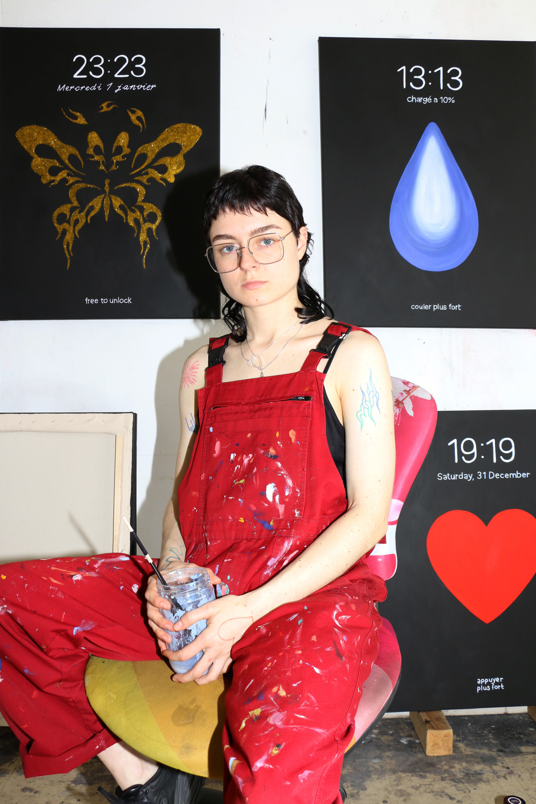 Ash Love s’intéresse à la toile du récit, la manière dont on l’assemble, la façonne, la fait dévier de sa trajectoire évidente. Par une pratique polymorphe de la peinture, sculpture, installation, performance et écriture, iel compose des pièces polysémiques, alliant alphabets multiples, emojis et artefacts personnels. Ses récits se déroulent sur la surface de la toile, dont le fond est peint en noir, analogie à l’écran numérique. Texto, stérilet, cadenas et cœurs brisés, le champ lexical de son travail investit des formes intimes mais communes, où le sens et le non-sens se déchiffrent comme un rébus. Par entrecroisement de ses dessins et de formes trouvées sur internet, chaque image participe à l’élaboration d’un lexique. Son travail évolue dans le domaine des mots, espaces clos qu’iel cherche à ouvrir, trouer, comme pour s’assurer que leur pensée ne sera jamais complètement encerclée par leur.s définition.s. Le cadre des espaces normés, comme l’écran du téléphone, fonctionne comme structure à l’élaboration de la narration. L’espace physique mais aussi virtuel de la toile (web) se mêlent, interfaces dans lesquelles interagissent les voix multiples du je - personnel et collectif - que nous habitons. Son travail est marqué par une subjectivité queer, et se porte sur les identités et récits de minorités de genre qui se définissent en dehors de la binarité. Le travail de Love est un questionnement permanent sur les outils qui permettent de composer et décomposer le(s) réel(s) et tous les interstices des récits - politiques, poétiques et potentiels - qui restent à écrire.